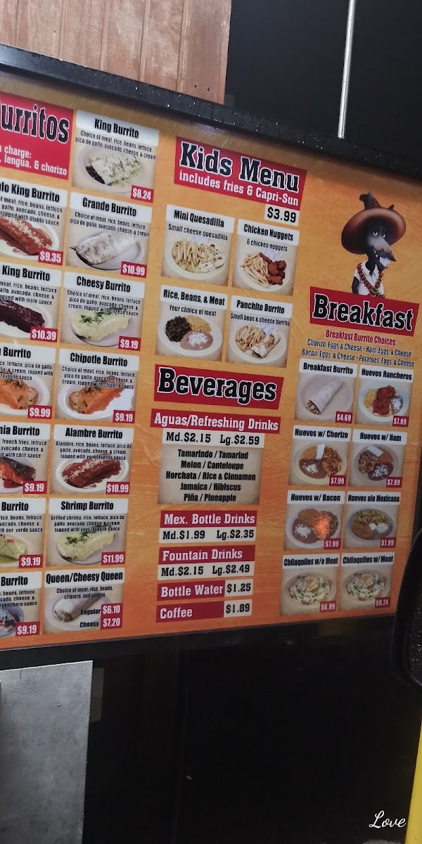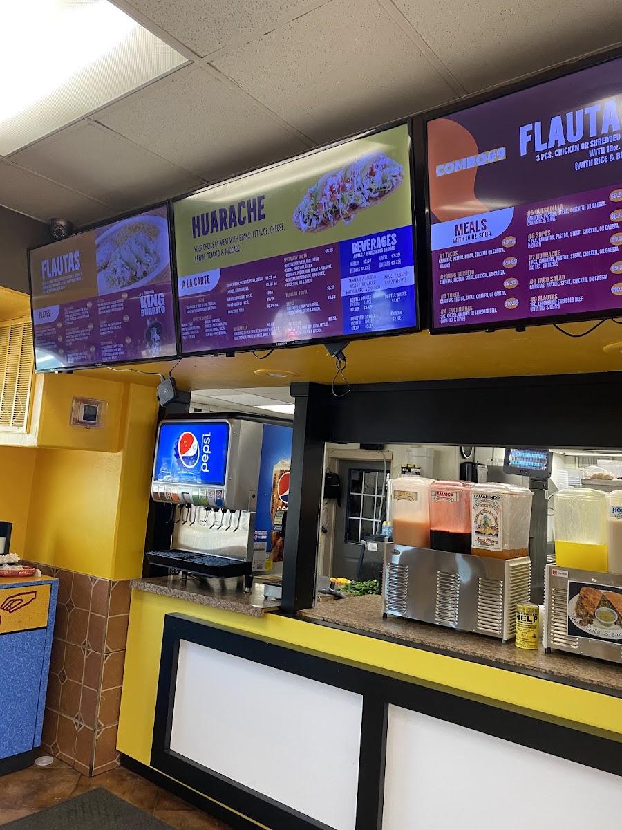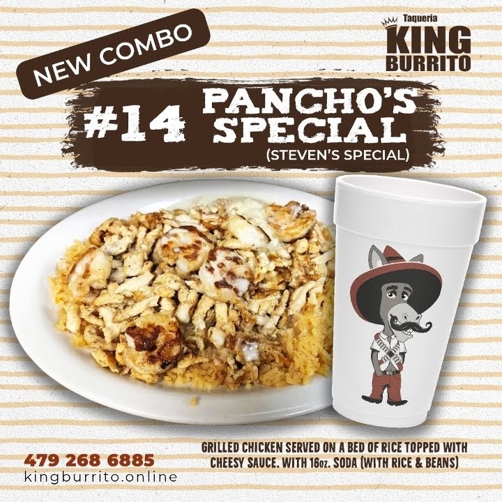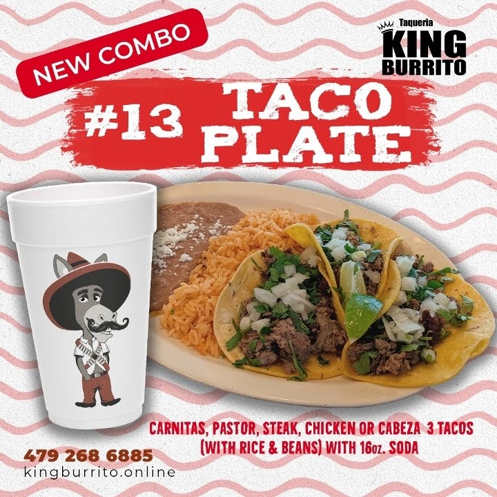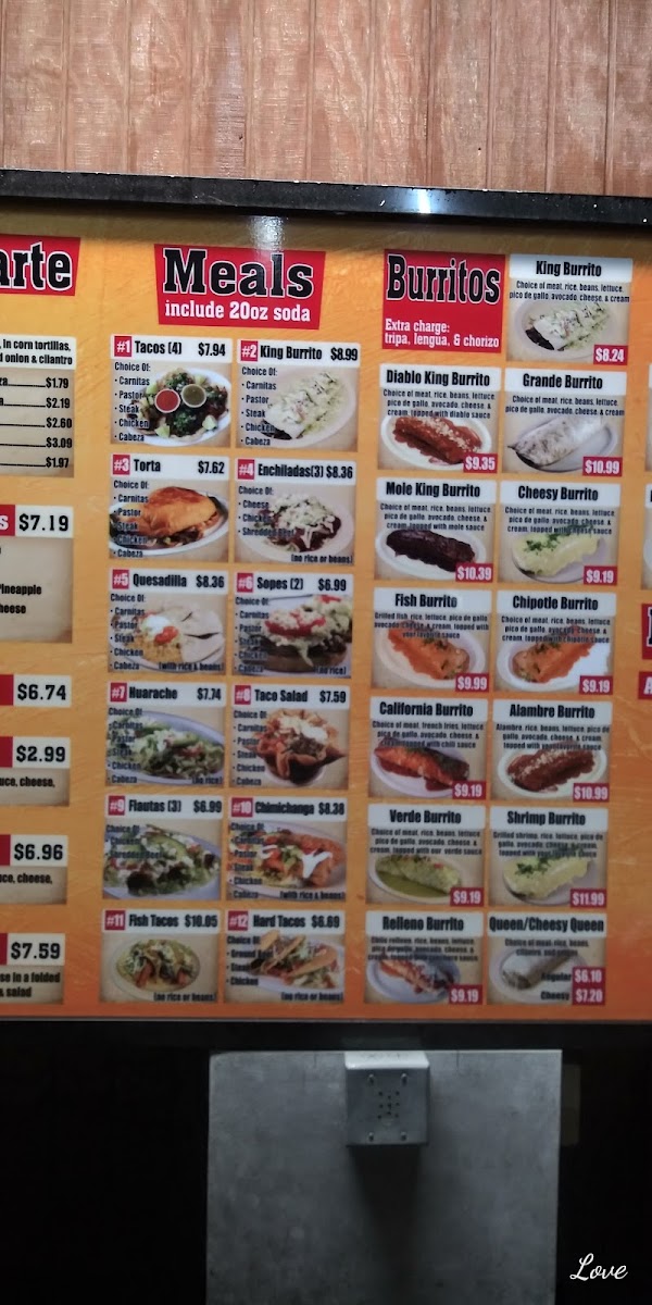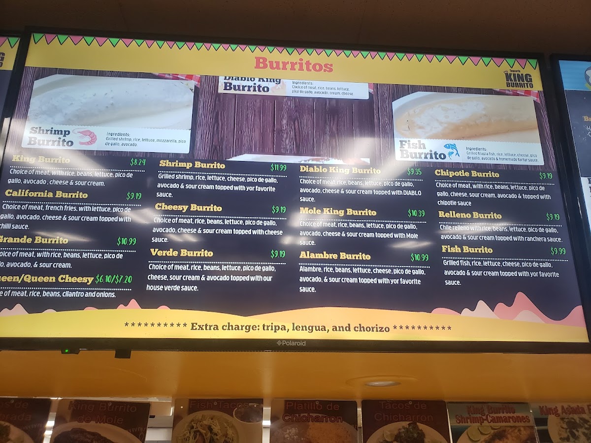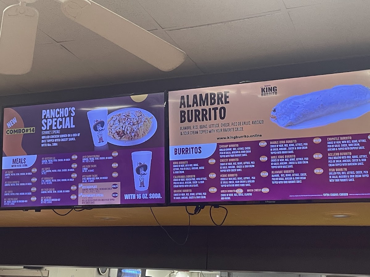 - Highlighted items include burritos such as the Cheesy King Burrito, Alambre King Burrito, and Tacos Alambre (three pieces).